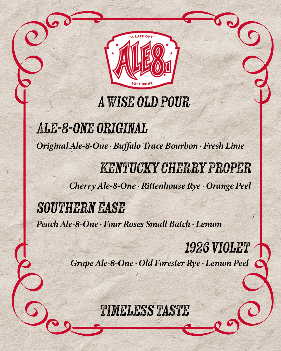 The cocktail menu places Ale-8-One directly in moments of choice, when guests are browsing drink options, considering flavors, and deciding what feels right for the night. Positioned alongside bourbon and rye offerings, Ale-8-One-based cocktails feel considered and credible, not promotional. This channel works especially well for “A Wise Old Pour” because it frames Ale-8-One as a trusted companion behind the bar. By presenting the drink through curated pairings rather than overt branding, the menu reinforces Ale-8-One’s heritage, restraint, and quiet confidence at the exact moment a pour is being chosen.